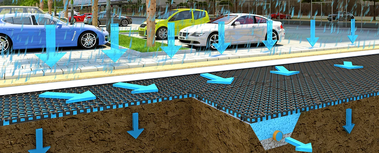 Moderne Lösungen wie Aquabox, Drainroof und Geocell schützen vor Hochwasser. Sie mildern auch die städtischen Wärmeinseleffekte ab.